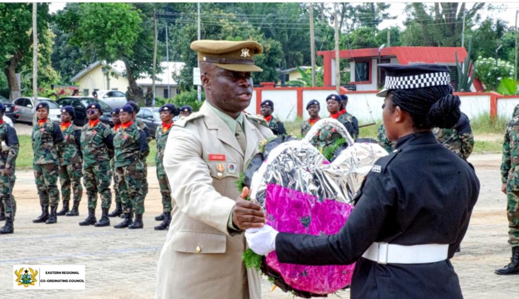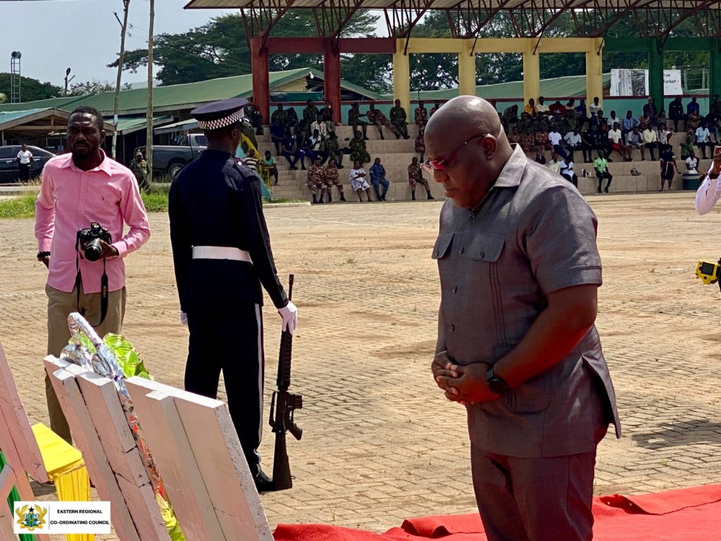 The Regional Minister, Hon. Seth Kwame Acheampong, representing the President of the Republic, led the wreath-laying ceremony alongside the Commanding Officer of the First Infantry Battalion (IBN), the Chairman of the Veterans Administration Ghana (VAG) on behalf of the soldiers, and the Oyokohene of New Juaben, representing the Omanhene of New Juaben Traditional area. Daasebre Kwaku Boateng III.
