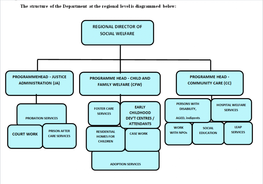 The Department of Social Welfare is decentralized and operates under the Regional Coordinating Council of the Local Government Service. It is mandated to carry out programs and projects to address the needs and concerns of the vulnerable, disadvantaged and marginalized.